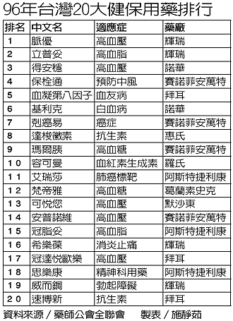 藥師李彩蓮指出,從前20大排行來看,仍以治療高血壓、高血脂和高血糖等慢性病占大多數,其中高血壓藥堪稱最賺錢的藥,7種藥品上榜,歐美及日本各大藥廠全心全力想研發的藥品,就是高血壓藥,美國食品及藥物管理局去年也核准數種高血壓藥上市。