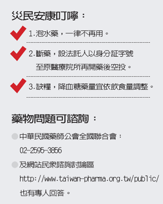 提醒受災同胞,目前除了須防範水患造成病原孳生,可能引發的疫情外,用藥多一點小心,也能減少一些健康的危害,讓我們有更多的精力,一起重建家園。