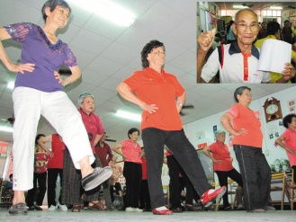 南投縣「長者健康促進班」帶領銀髮族玩律動保健康,高齡91的溫阿乾(右上)「健康促進存摺」更是滿滿的健康紀錄。