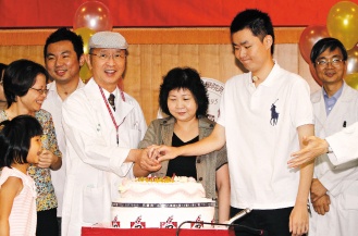 台大醫院外科部主任李元麒(左三)上午出席台大醫院肺臟移植15周年記者會,並在會中與肺臟移植病友陳浮陽(中)、洪晟峰(右二)一起切蛋糕,共同慶賀在手術後重生。
