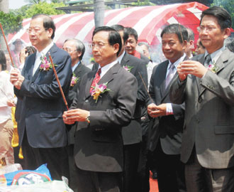 台南市安南醫院昨天動土,市長許添財(前左二)與中國醫藥大學暨附設醫院董事長蔡長海(前左一)上香敬拜天地。