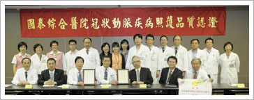 財團法人醫院評鑑暨醫療品質策進會(簡稱醫策會)所推出的疾病別照護品質認證是以病人安全及醫療品質為主軸,除了以醫院整體醫療品質及病人安全的評鑑外,針對單一疾病團隊診療更深入、品質要求更高的認證。此次國泰綜合醫院以冠狀動脈疾病參與認證評鑑,統籌心臟內外科、急診、加護病房、手術室、麻醉科、病房、藥劑科、營養組等共28個單位,組成冠狀動脈疾病照護團隊,凝聚共識、教育訓練及院內外專家指導,於今年4月通過評鑑,並由醫策會謝博生董事長親臨授證。