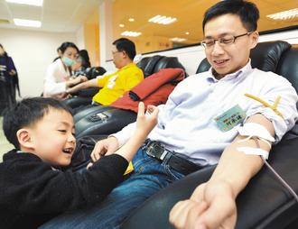 37歲的何承謙說,雖然捐了百次血,還是每次看到針扎,心還是會「揪」一下,但只要想到這袋血,能幫助人,就會感到非常快樂,昨天他還帶小兒子前來「見習」。