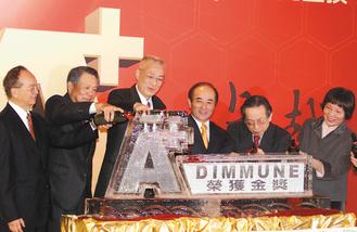 國光生技榮獲「二○一○國家生技醫療品質金獎」,昨天舉行慶祝酒會,董事長詹啟賢(左二)邀請行政院長吳敦義(左三)、立法院長王金平(右三)、國家生技醫療產業策進會會長陳維昭(左一)、政務委員張進福(右二)與衛生署副署長蕭美玲(右一)等人一同與會慶祝。
