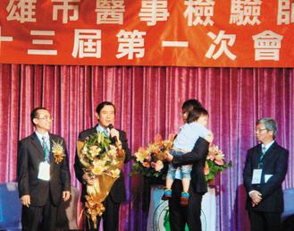總統馬英九出席高市醫檢師公會,接受理事長蔡忠義3歲小孫子獻花,他笑說,理事長小他9歲就有孫子,是示威嗎?
